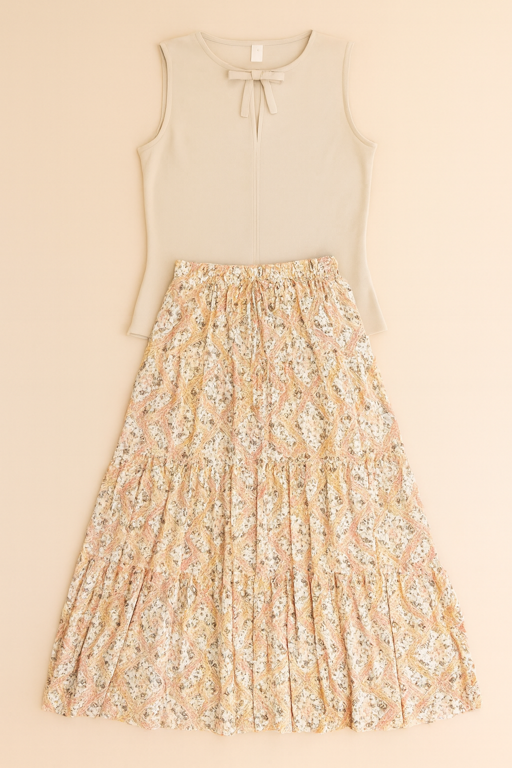 Kensington Tie-Neck Tank + Bramley Bloom Skirt or Amberwood Pumpkin Wide Leg Trousers - capture the essence of an English countryside autumn. The creamy tie-neck top adds a touch of refined charm, while the floral skirt sways with romantic ease in soft golden and blush tones. Add more rustic charm with the pumpkin wide leg trousers. Layered with cozy knits or worn simply on its own, this pairing feels timeless yet inviting. Perfect for fall markets, pumpkin patch afternoons, or quiet moments with a cup of cider, it’s a look that brings the poetry of the season to life.