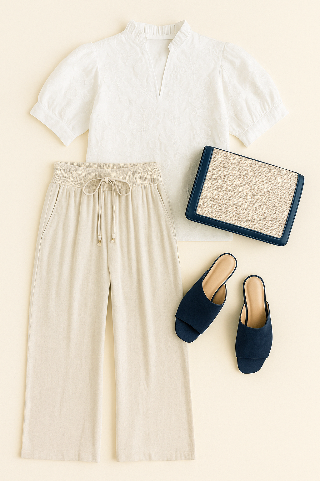 Camberley Embroidered Blouse + Willow Glen Linen Trousers + Stratford Navy Leather Rattan Purse