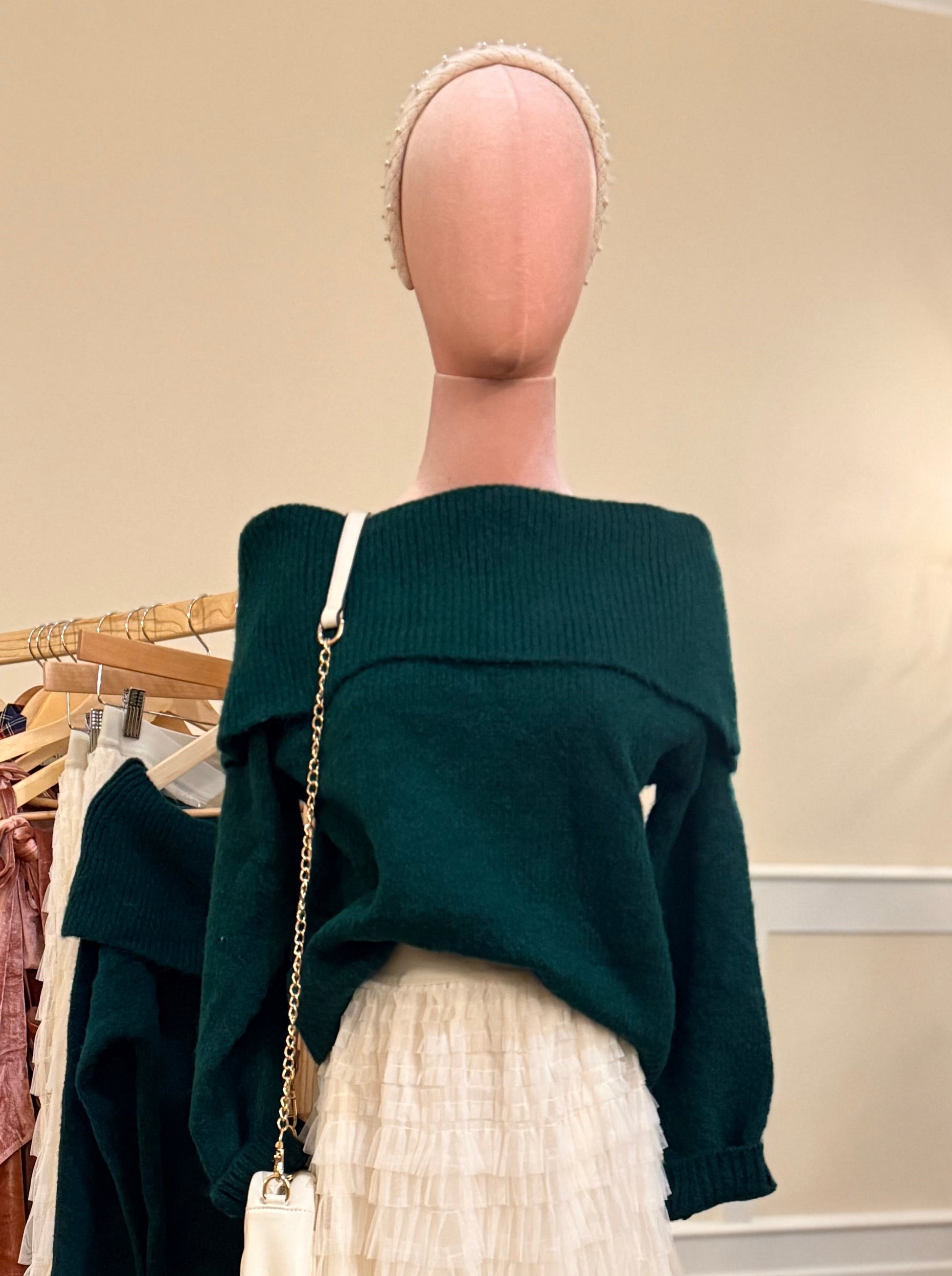 Its deep emerald hue feels timeless and refined, while the graceful off-shoulder neckline adds a touch of romantic ease. Soft, cozy, and beautifully draped, it's the perfect knit for holiday gatherings, winter teas and cozy nights.