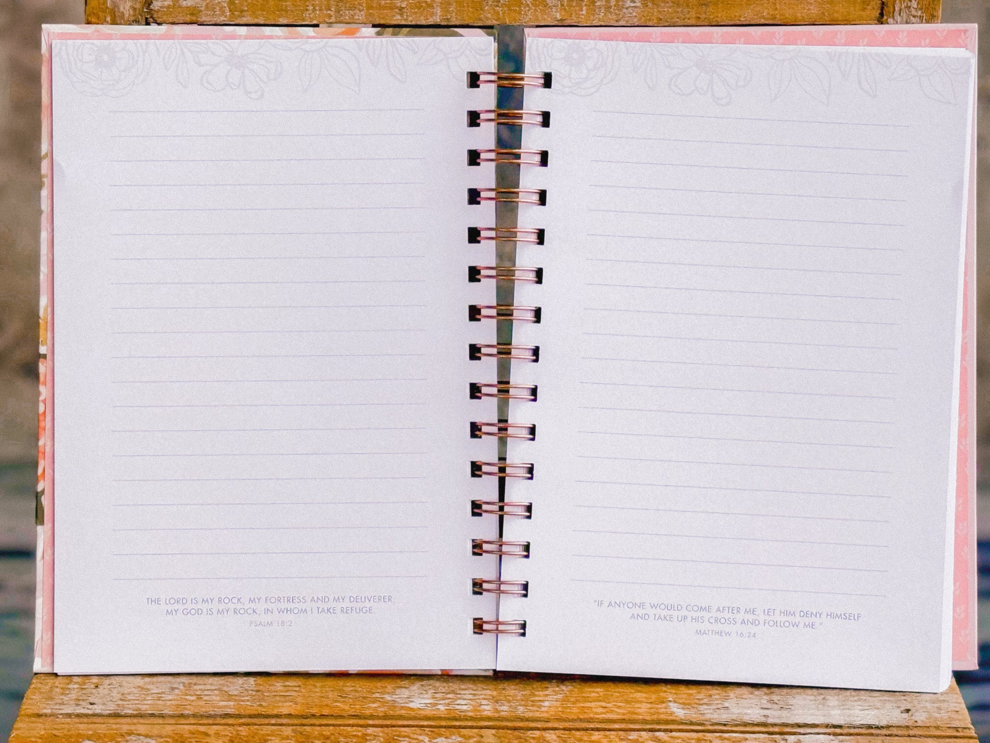 Pink wire bound hardcover journal with gold-foil Proverbs 31:25 and 192 lined Scripture pages. Colorful floral design, Pink background, Gold-foiled sentiment.