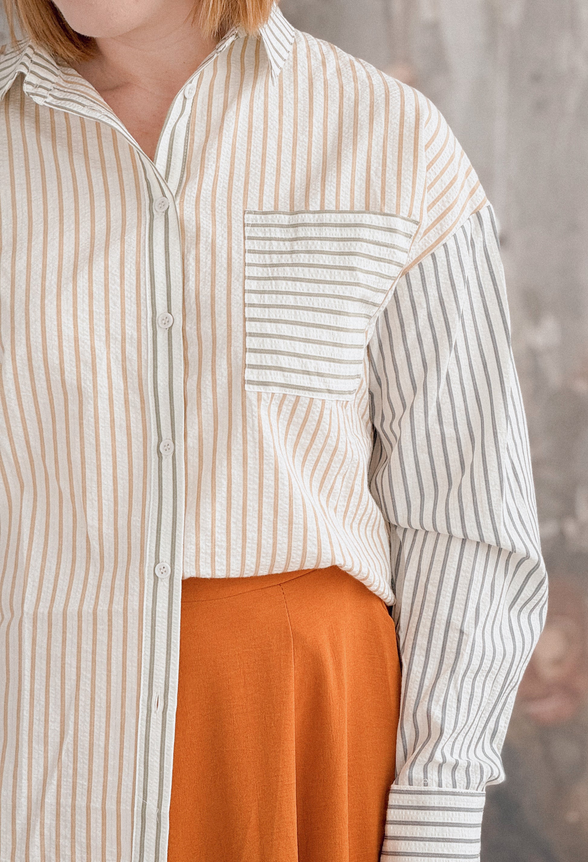 Classic and effortless, the Bramblewood Oxford Stripe shirt is a timeless button-down with a modern twist. Designed with a mix of vertical and horizontal stripes, it adds subtle visual interest while keeping the look polished and versatile. The relaxed fit makes it perfect for layering over tanks or tucking into skirts and trousers for a tailored countryside feel.